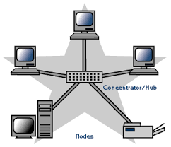 Topologi star melibatkan suatu hub sebagai tempat di mana setiap anggota jaringan terhubung padanya. Setiap komputer dalam jaringan harus melalui suatu pusat yang disebut hub, baru kemudian dilakukan transmisi ke komputer-komputer lainnya yang juga terhubung ke hub.
